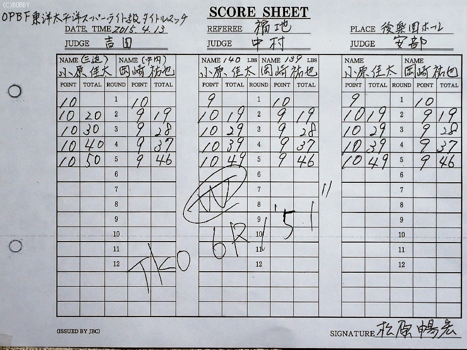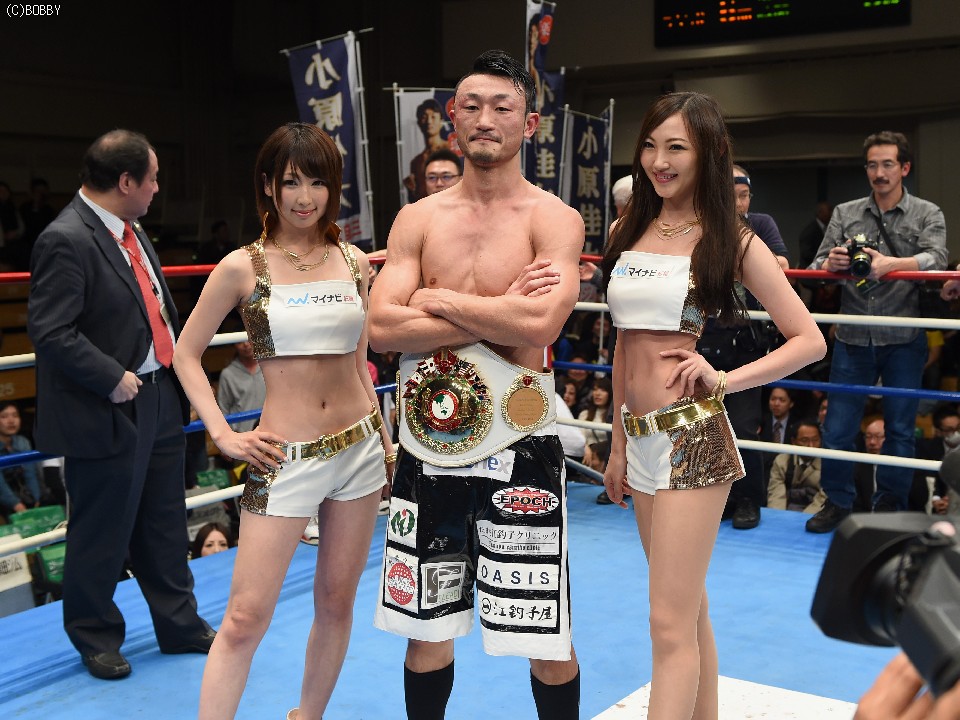 一方、6ラウンドのパンチは「効いていない。バランスを崩しただけ」と苦笑いした小原。KO防衛に「記録はまったく意識していないが、ホッとした」と安堵の息を漏らした。内容については「序盤は様子見と決めていたが、その後は相打ちが怖くて臆病になっていた。いつも警戒し過ぎてしまう」と反省も多かったが、「予想より岡崎選手が出てこなかったのがプラスに働いた。遅いペースなら僕に分がある。途中採点はトントンかなと思ったが、リードしているなら求められるのはKOだと思い強気で攻めた」と少ないチャンスをモノに出来たとも喜んだ。