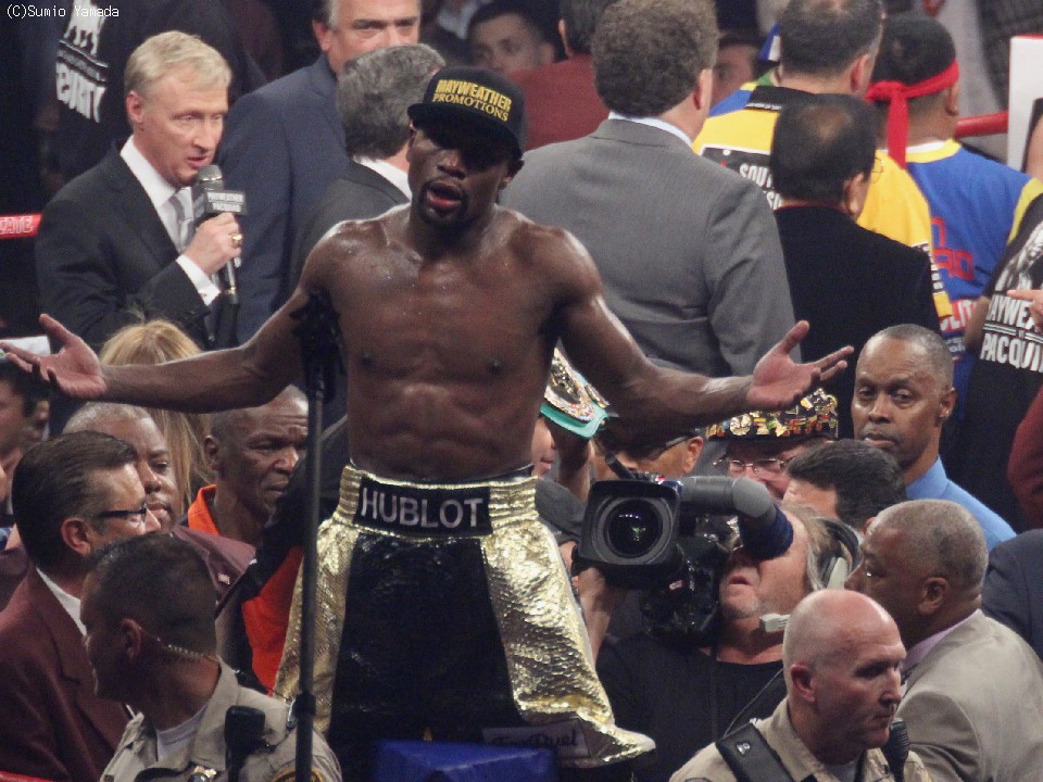 5月2日(日本時間3日)、米国ネバダ州ラスベガスのMGMグランドガーデン・アリーナでマニー・パッキャオ(36=比)に12回判定勝ちを収め、ウェルター級のWBA、WBC、WBO3団体統一王者になったフロイド・メイウェザー(38=米)は、試合後の会見であらためて「9月の試合がラスト・ファイト」と宣言した。
