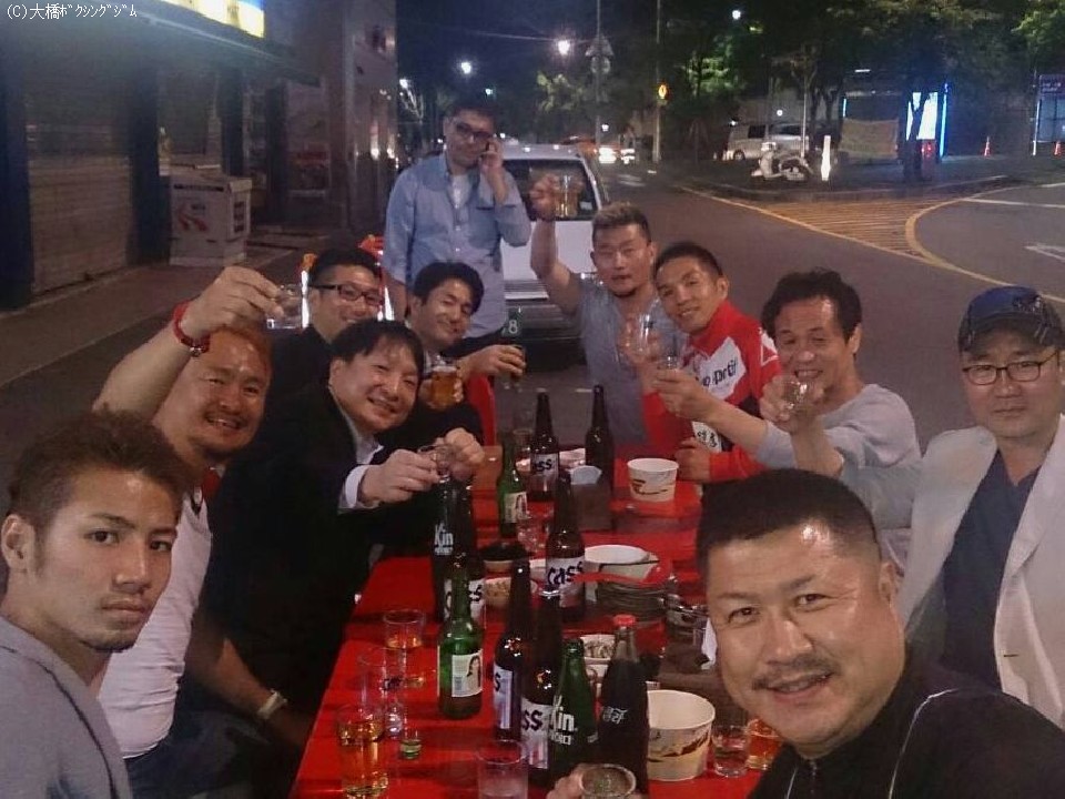 前日の公開計量では、WBA世界ライトフライ級王座を18度防衛し今回の日韓戦で韓国の監督を務める柳明祐氏と日本監督の元WBC・WBA世界ミニマム級王者の大橋秀行会長が急遽、計量対決に。大橋会長が文句なしの勝利を収め、対決後は柳氏と旧交を温めていた。