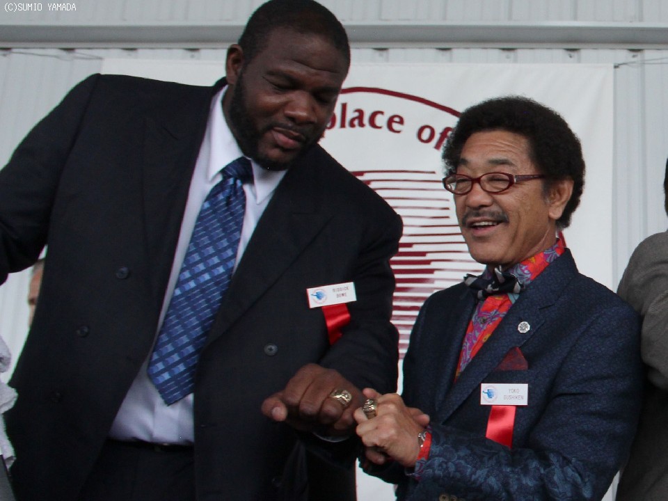ボウ氏と殿堂指輪を合わせる具志堅氏