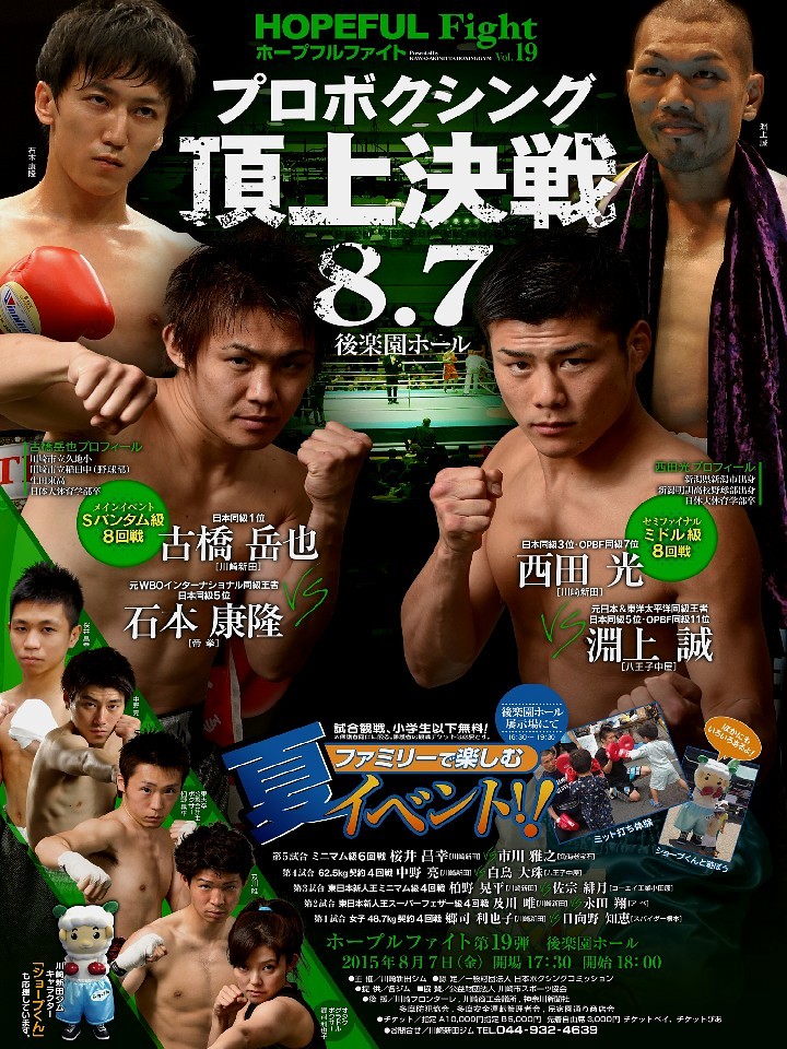 当日の興行はダブルメインとして、日本Sバンタム級1位・古橋岳也(川崎新田)対日本同級4位・石本康隆(帝拳)、日本ミドル級3位・西田光(川崎新田)対元日本&OPBF同級王者・淵上誠(八王子中屋)のともに興味深い8回戦がラインアップ。賑やかなイベントが注目対決に華を添えてくれそうだ。