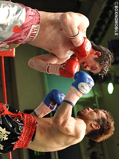 56.0kg契約決勝は、斉藤純彦(輪島)と土居コロニータ伸久(ヨネクラ)が拳を交える。土居がベテランの巧さを垣間見せ、2回TKOで斉藤を打ち砕き、レイジングバトル優勝を奪い獲った。