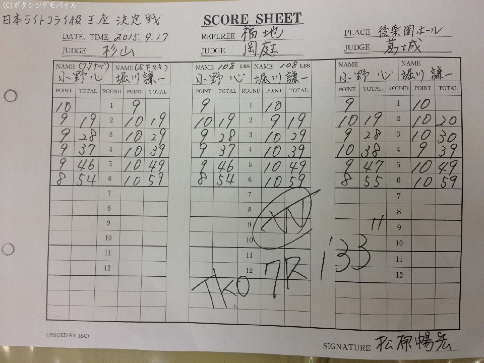 日本ライトフライ級王座決定戦が17日、日本ランキング1位の小野心(ワタナベ) と同じく2位の堀川謙一(SFマキ)によって後楽園ホールで行われた。