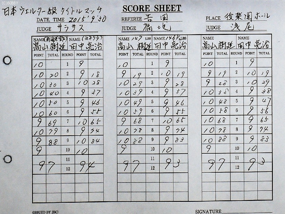 序盤、連敗中ながら急遽挑戦者に抜擢された田中がフットワークを使い、右ストレートを当てたが、3回から高山が見栄えの良い右ボディをヒット。ロープに詰めて攻勢をかけた。後半は5ラウンド終了の公開採点で1、3、4ポイント差でリードを許した田中が反撃。ポイントを奪い返したが、高山はペースを渡さずボディを打ち続け田中を苦しませた。