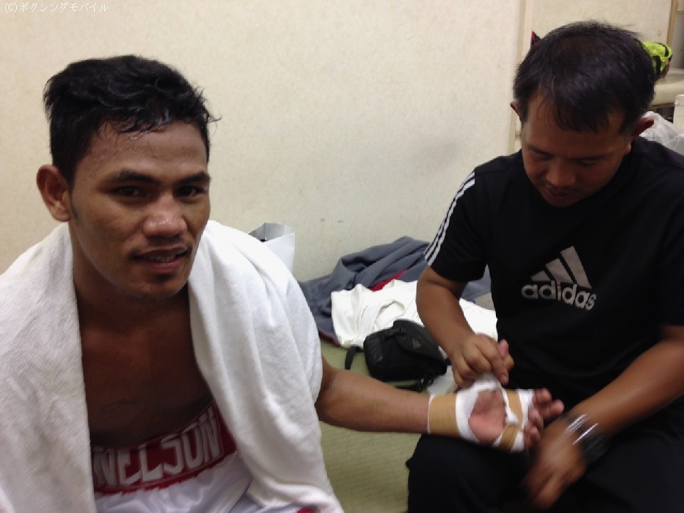 グローブを外しながら取材に答えたグルペは「腰にパンチをもらってしまった。横っ腹にもらったパンチが効いてしまった」と敗戦を悔しがった。