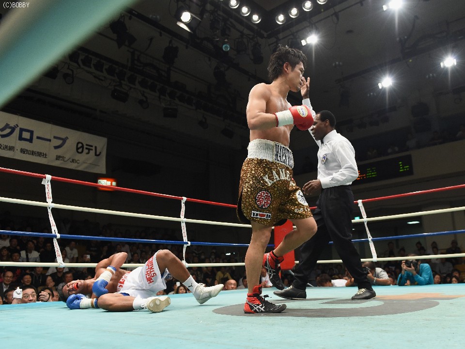 立ち上がりは本来のキレはなく、動作に重さを感じさせた亀海だったが3ラウンド、左ボディでダウンを奪うと終了間際に右クロスでキッチリ仕留めて、一年半ぶりの後楽園ホールでウィニングコールを聞いた。