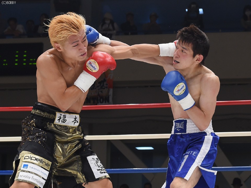 第4試合は、6月に江藤光喜(27=白井・具志堅スポーツ)が保持するOPBF東洋太平洋フライ級王座に挑んで以来の再起戦となる日本フライ級10位・福本雄基(29=三迫)が出場。これが初のA級の試合でランカー初挑戦となる大平真史(31=マナベ)を迎えての一戦となった。試合は中盤まで激しいポイント争いとなったが、力が入りいつもより手数が少ない福本に対し、リズムに乗った大平が変則的な動きでポイントを稼ぐ。6回に福本がホールディングで減点1をもらい、これが勝負の分かれ目となった。