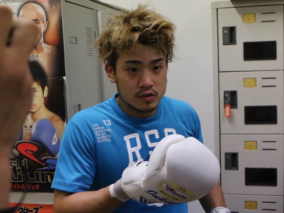 スパーリング後に取材に応じた辰吉は「頭を振ること考えてやりました。今は左の使い方を中心に練習しています。まだまだやりたいことは出来ていませんね」と言葉少なにバック打ちに移動した。