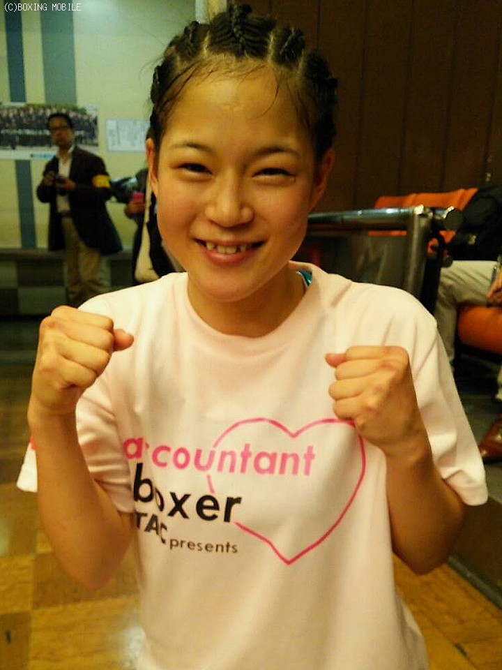 また、TKO勝ちを飾った高木は、はち切れんばかりの笑顔で3戦目での勝利を喜んだ。「左ストレートが決まり、相手が怯んだので最後はスタミナを考えず、ここしかないと思って連打した」。現在、中央大学4年生の高木は、卒業後は大手監査法人の就職も決まり洋々たる未来が開けているが、後藤同様に「自分の力がどこまで通用するのか挑戦したい」とボクシングに対する思いは貪欲。今後も二人の「全力女子」に注目したい。