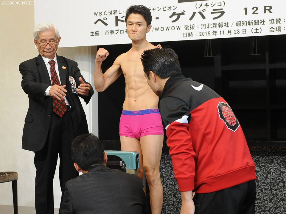 いよいよ明日28日に迫った前日本Lフライ級王者・木村悠(32=帝拳)の世界初挑戦。その調印式と計量が27日、決戦の地の仙台市内で行われ、WBC世界同級王者ペドロ・ゲバラ(26=メキシコ)と同級3位の木村は、WBC世界Sフライ級タイトルマッチに出場する王者カルロス・クアドラス(27=メキシコ)、同級2位・江藤光喜(27=白井・具志堅)とともに会場に姿を現した。