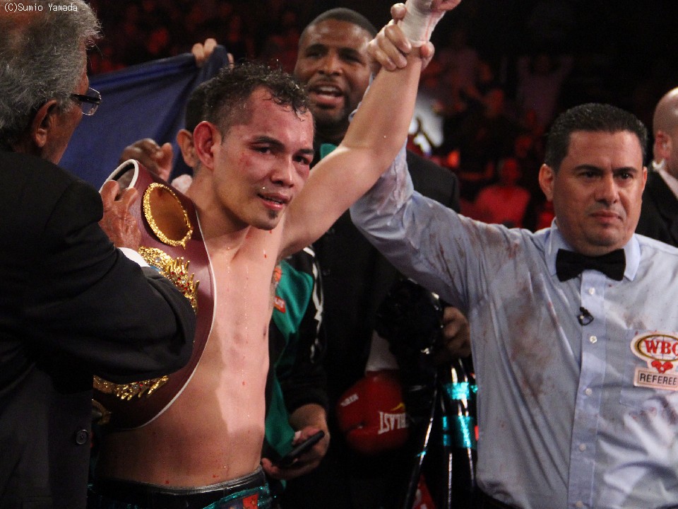 オッズは直前になって16対1から14対1に縮まったが、ドネアの圧勝が予想されたカードだった。その下馬評どおりドネアが序盤、スピードとパンチ力を生かしてリードを奪う。大きなヤマは4回に訪れた。揉み合いのなかでやや幸運なダウンを奪ったドネアが、さらに得意の左フックを叩きつけて2度目のダウンを奪ったのだ。これで勝負は決したかと思われたが、窮地を凌いだフアレスが中盤以降、反撃に出る。ドネアは6回に足を痛めたこともあり動きが落ち、フアレスの前進を持て余すシーンも出てくる。ドネアが左フックで相手の食い止めようとするが、若く勇敢なメキシカンは果敢に距離を詰めて逆転を狙う。終盤に入っても白熱した攻防は続いたが、最後の2回はドネアも再びペースを上げて勝利を決定づけた。採点は116対110が二者、もうひとりは117対109だった。13年4月にギジェルモ・リゴンドー(キューバ/米)に敗れて手放した王座を2年8ヵ月ぶりに取り戻したドネアは39戦36勝(23KO)3敗。敗れはしたものの株を落とすことのなかったフアレスは21戦17勝(13KO)4敗。