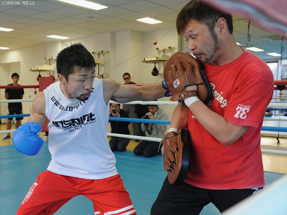 勝てば3階級制覇をはたすが、それよりも一度は失敗したこの階級で戦えることを証明したいとする八重樫。「年齢の分だけ積み重ねたものがある。それを上手く出したい」と笑顔を見せ、練習では松本好二トレーナーと徹底したボディ打ちの確認に余念がなかった。