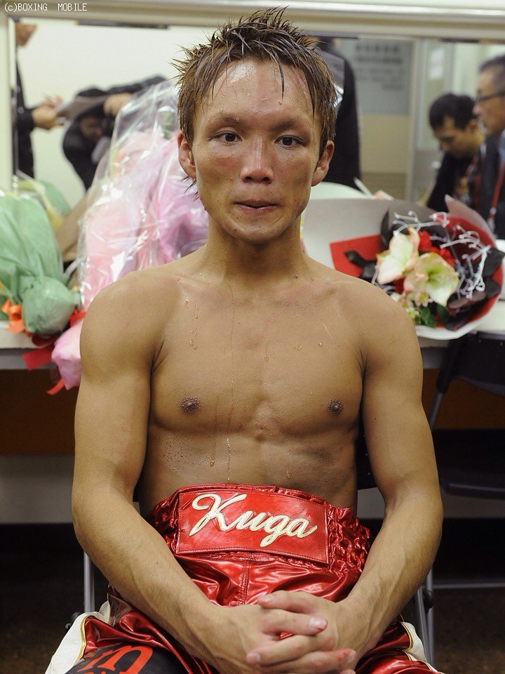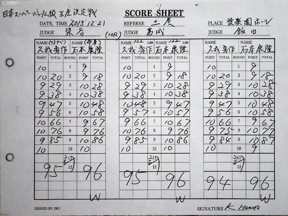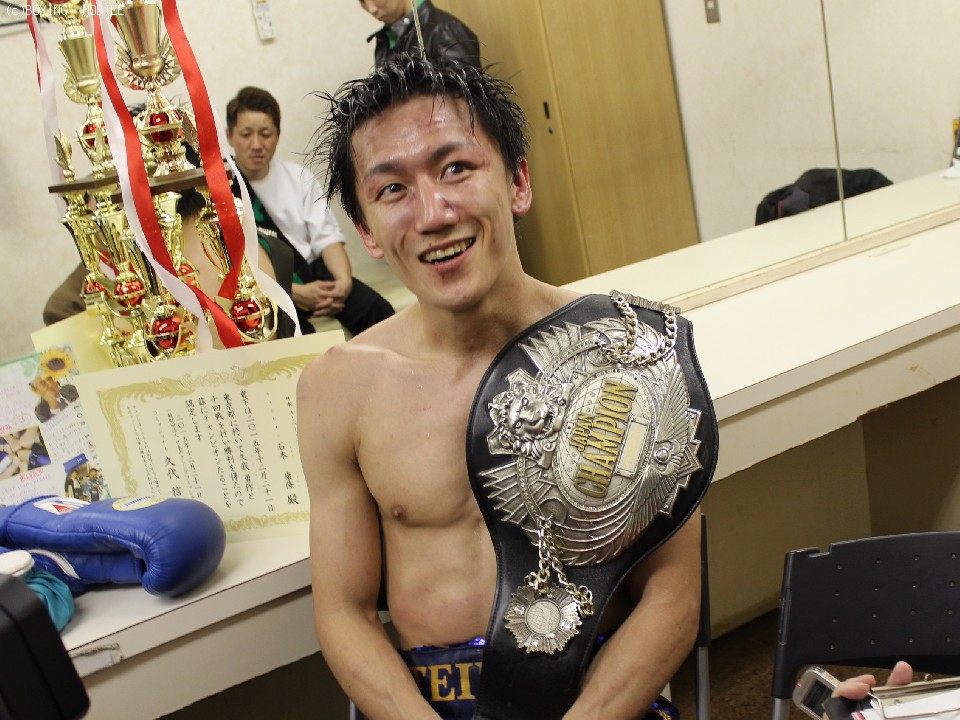 込むが、これが3度目の挑戦となる石本も左ボディで反撃。インターバル中には、応援合戦が繰り広げられるなか、両者一歩もひかない一進一退の攻防をみせた。5ラウンド終了時に発表された公開採点は2者が48-47が石本、残り1者が48-47で久我という大接戦。後半に入ってもお互いスタミナが切れる気配をみせず、手数を出して激しいペース争いとなった。9ラウンド、石本が距離を取りながら有効打を決めては要所要所で休むテクニックをみせた。最終回は年間ベストラウンドといっても過言ではない激しい打ち合いを展開。拍手喝采で終了した試合は1〜2ポイント差で石本が念願のタイトルを獲得した。