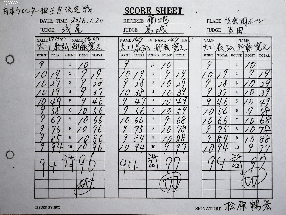 ゆったりとしたフォームから鋭い踏み込みでボディにパンチを集め、体力を削りにかかる大川に対し、長身サウスポーの新藤は中間距離から真っすぐに伸びた左ストレートを決めてポイントを奪った。採点の難しいラウンドが続いたが5回終了時の公開採点は46-49、49-47、49-46で新藤がリードして後半戦へ。ボディからペースを握りたい大川だが、打ち終わりに左を浴びる展開は変わらず。新藤はパンチが雑になった大川に左ストレート、右フックでポイントを稼ぎ続けた。最終回、大川の右ストレートで大きく腰を落とした新藤だったが、新藤も必死に持ちこたえた。後半引き離した新藤が2〜3ポイント差を付けた新藤が新チャンピオンに輝いた。