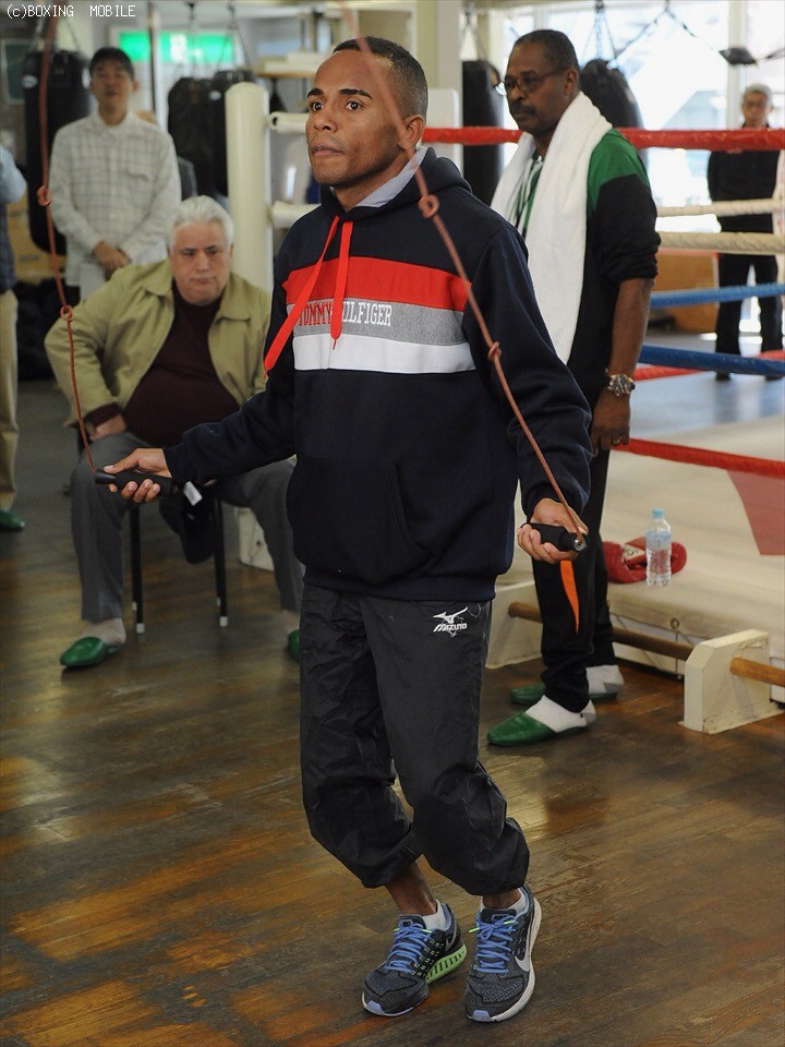 会見後に行われた練習では、スパーリングは行わず、軽くシャドーボクシングした後の縄跳びでは多くの報道陣が見守る中、マイペースに30分間休みなく飛び続けた。縄跳びでは軽快なステップを刻みリズム感のあるところを見せ、その後はサンドバッグ、パンチングボール(シングル、ダブル)でたっぷりと汗を流した。