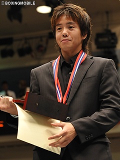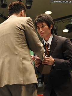 22日、後楽園ホールで開催されたトクホンダッシュエアロのメインイベント、日本ウェルター級王座決定戦の前に、8月度月間賞授賞式がリング上で執り行われた。8月度敢闘賞を受賞した日本スーパーバンタム級王者・芹江匡晋(伴流)と、最優秀賞(MVP)を受賞した日本フライ級王者・清水智信(金子)が表彰式終了後、今後の豊富と展望を語った。