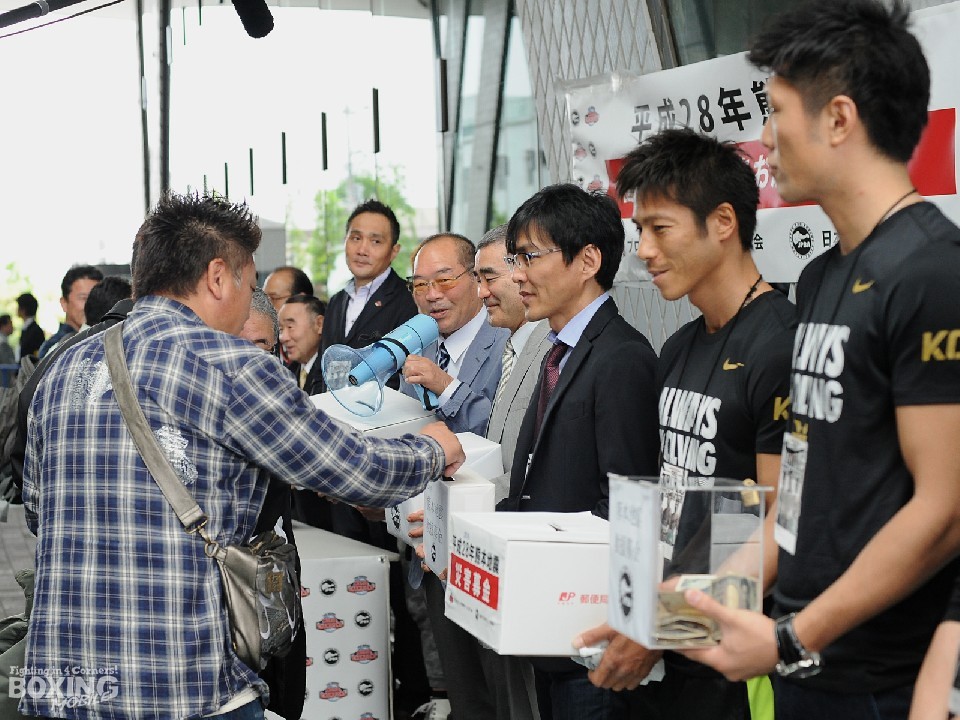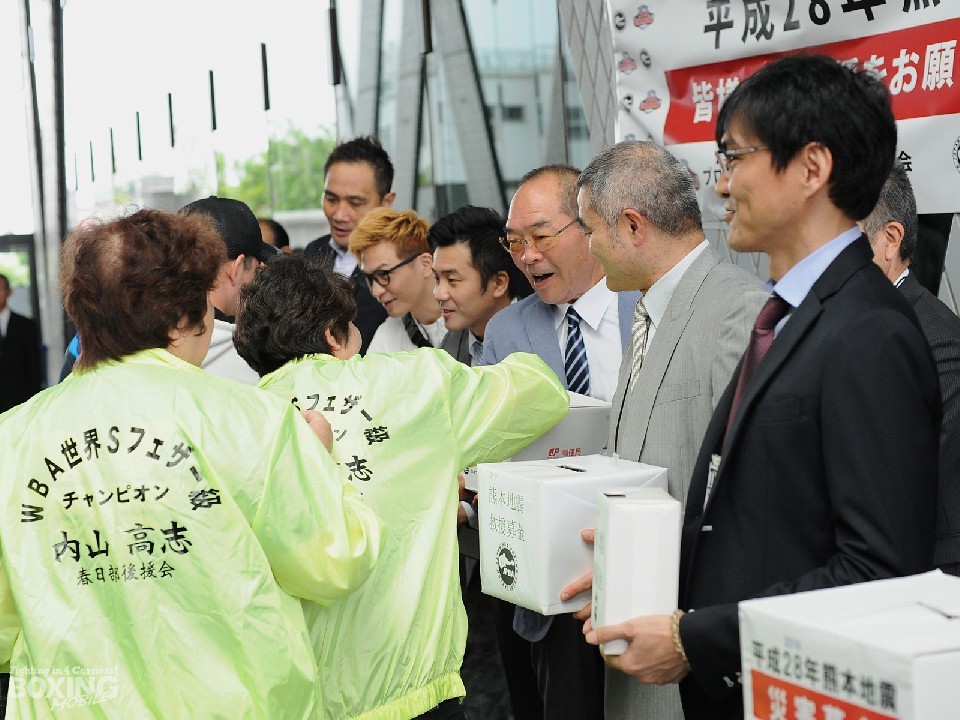27日、東京・大田区総合体育館で開催されるWBAトリプル世界戦の会場入口では、新旧の世界王者によって組織される世界チャンピオン会が、14日から発生している熊本地震の被災者を支援するため募金活動を行った。