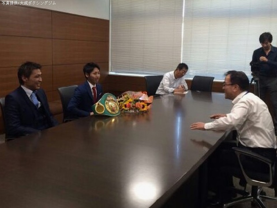 三田市内の大成ジムに所属する前東洋太平洋ミニマム級暫定王者でWBO同級1位の加納陸(18)と丸元大成会長が3日、三田市役所で森哲男市長を表敬訪問し東洋太平洋ミニマム級暫定タイトル獲得と、次戦、8月20日(日)に三田市駒ヶ谷体育館でWBO世界ミニマム級王座決定戦に臨むことを報告した。