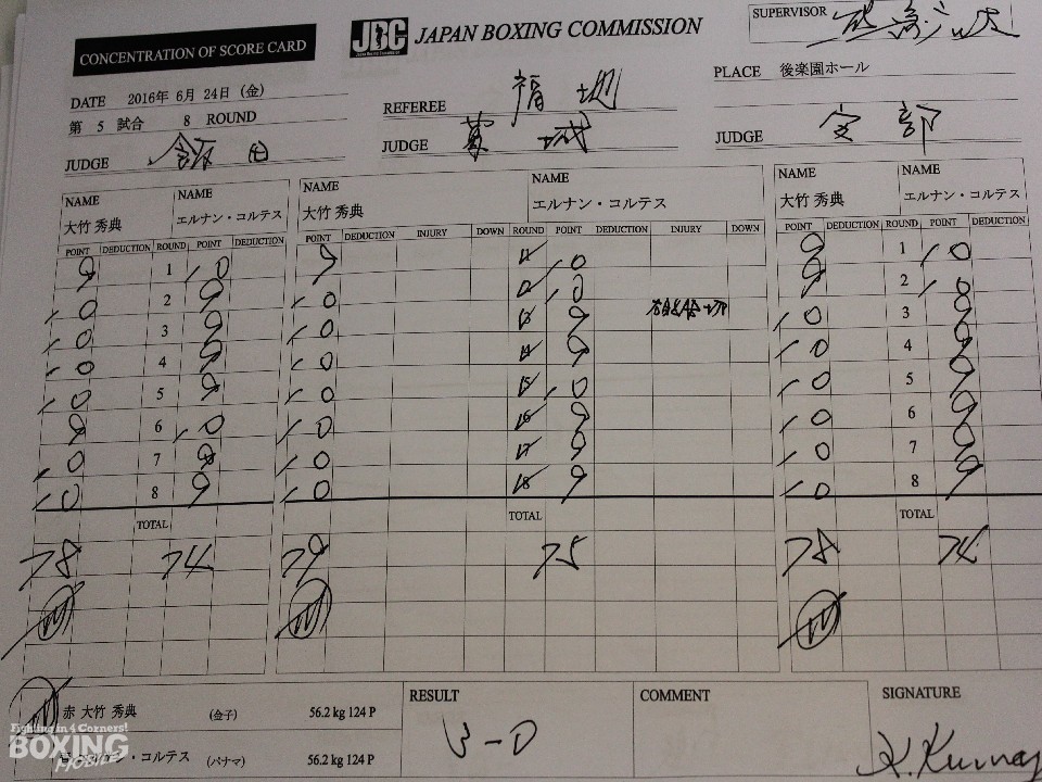 約4年半ぶりのサウスポーとの対戦となった大竹は序盤、ジリジリと前に詰めるがコルテスの柔軟なボディワークにクリーンヒットを奪うことができない。逆にコルテスは下がりながら大竹の出鼻に左を合わせ曲者ぶりを発揮。中盤、パワーで上回る大竹は単発ながら右ストレートを当ててペースを取り戻す。大竹は強引に距離を縮めて、ボディに連打を繰り出しコルテスを後退させた。大竹が中南米独特のリズムに手を焼きながらも判定勝ちを収めた。