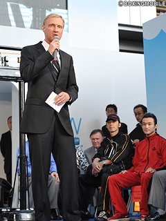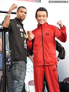 そしてWBC世界スーパーバンタム級タイトルマッチの計量前、明日のリングアナウンサーを勤めるジミー・レノンJrが登場。「レディース&ジェントルマン!!」の名文句で、キャノピースクエアをシーザースパレスかMSGの雰囲気に一転させると、公開計量の盛り上げに努めたレノンJrがこの日の主役の座を奪い取った。