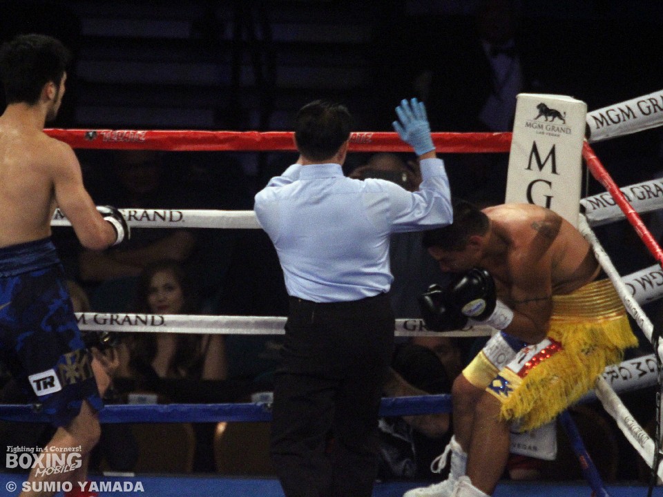 膝をつきながらカウントを聞いたタドニッパはぎりぎりで立ち上がった。再開後、村田はコーナーに追い詰め、右ストレート、左ボディブロー、さらに右、右、右と連打。ここまでとみたレフェリーが試合を止めた。