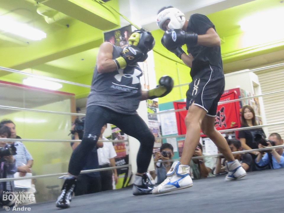 練習は入念なウォームアップ後、同門の前日本スーパーフライ級王者の石田匠(24)と2ラウンドの軽めのマスボクシングを披露。会長が会見で話したように足を使い石田に的を絞らせない動きから左アッパー・右ストレートとキレのある動きで体調の良さをアピールした。