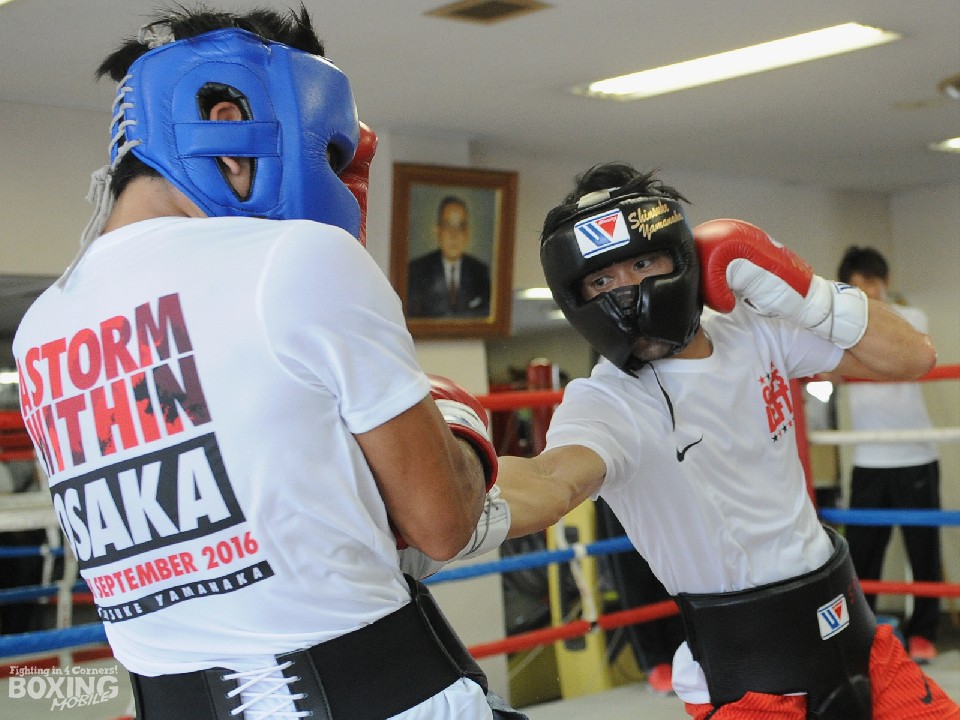 すでに12度目の世界戦で最多となる140ラウンドのスパーリングをこなしたという山中は、ジムメートの佐々木洵樹を相手に2ラウンドのスパーリングを披露。1回は右ジャブをインサイド、外側、さらにボディに打ち分けるなど多彩なリードブローで佐々木を煽った。これが試合でも機能すれば相手に隙をつくらせることができるはずだ。2回には、セコンドから「打ち終わりに気をつけろ」というアドバイスが飛ぶなか、「前回よりも感覚がいい」(山中)という得意の左ストレートを連発してパートナーを後退させた。これまで試合のたびに何度も練習相手を務めてきた佐々木は「(山中の)右ジャブは上下に打ち分けてくるので分かりにくいうえ、突き刺すような感じで強い。以前はインサイドからだけだったが、きょうはフックもあって防ぎきれなかった。左は相変わらず強く、14オンスのグローブでも効く」と感想を口にした。