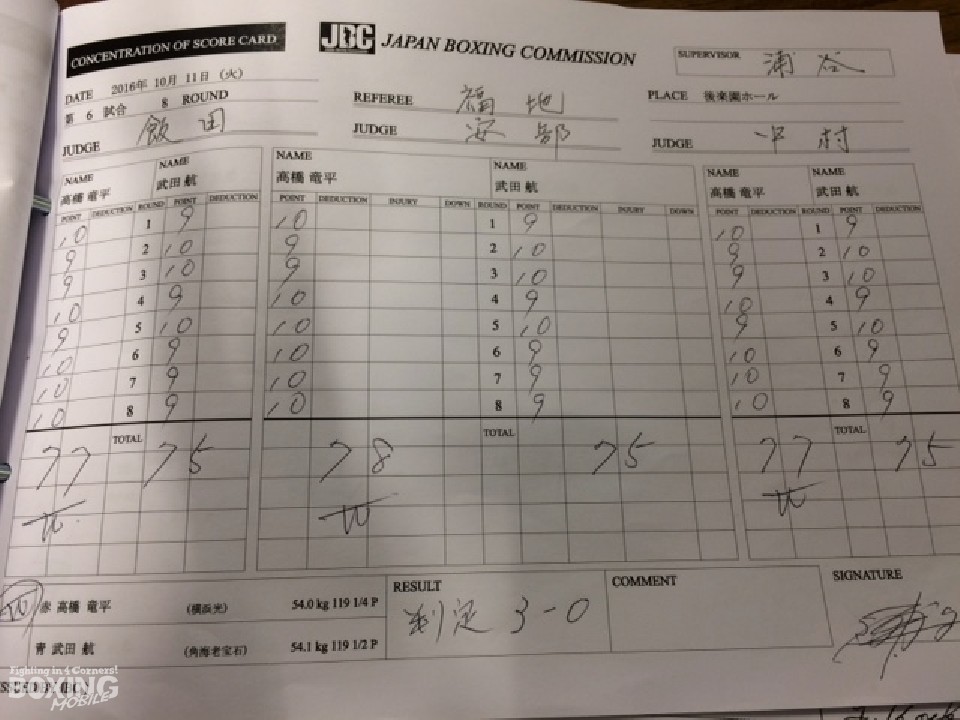 7月にオーストラリアで敗戦して以来の再起戦を勝利で飾った高橋は「スパーリングでサウスポーがいなくて苦労したが、距離がもっと遠いと思っていた。どうやってパンチを当てるのかを練習してきたので成果が出た」と冷静に試合を振り返った。「もっと器用な細かいボクシングが出来るのようになってまたランキングに復活したい」と抱負を口にした。