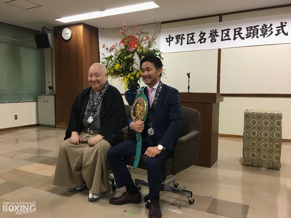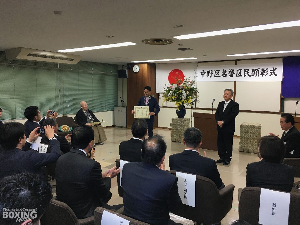 この日の式典で山中の栄誉を称えた田中大輔区長は、東京で開催された山中の世界戦は、初防衛戦から毎回応援のために会場まで足を運んでいる。「実は引越しも考えていたけど…」と笑いを誘った山中慎介だが「現役中はしっかり稼いで納税します」と2009年から住んでいる中野区に恩返しすることを約束した。