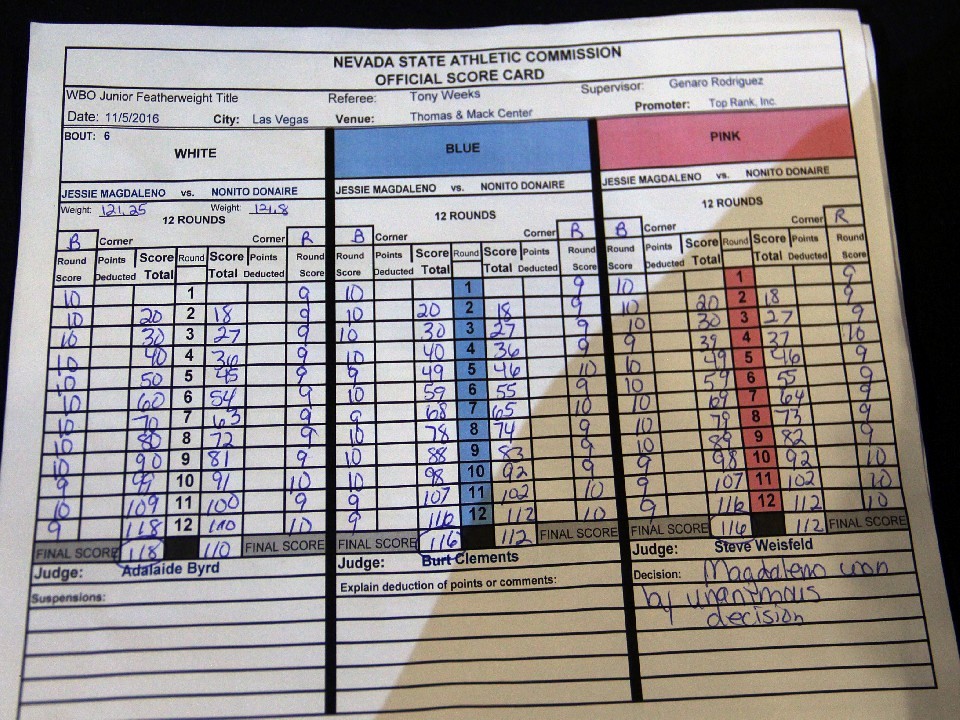 ドネアが圧力をかけ、サウスポーのマグダレノがカウンター・アタックを狙うという展開に終始した試合だが、競った内容だったものの中盤まではマグダレノの手数とヒット数が上回っていた。終盤になってドネアが追い上げたが届かなかったという印象だった。採点はバート・クレメンツ、スティーブ・ウェイスフェルドの両ジャッジが116対112の中差だったが、アデライド・バード氏は118対110の大差をつけていた。バード副審がドネアに与えたポイントは10回と最終回だけで、9回まではマグダレノのフルマークだった。「世界王者になれて嬉しい。これが事実だなんて信じられない」と新王者は喜んだが、同じようにドネアも「信じられない」と、こちらは採点に不服を唱えた。「勝ったと確信していた。負けていたなんて思いもしなかった。特に後半は良かったし、試合全般を通じてコントロールしていた。信じがたい」と不満を口にした。今回の試合からコンビを組んだイスマエル・サラス・トレーナーも「後半を支配していたし、明らかに勝ったと思った」と口を揃えた。16日に34歳になる「フィリピーノ・フラッシュ」が引退することはなさそうだが、マグダレノとの再戦を目指すのか、それとも他団体の王座を狙うのか、さらには再びフェザー級に上げるのか、今後の動向に注目したい。