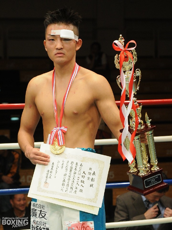 敢闘賞は大野俊人(石川ジム立川)。ボクシング芸人やすおかだいごの一押しカード、小林孝彦(TEAM10COUNT)との倒し屋対決を5R 0分30秒TKOで勝利しての受賞となった。「勝ちだけを意識していたし顔が痛かったので賞は考えられなかった。ポイントで負けているので倒してやろうと思った。会長には11歳の時からお世話になっているので本当にうれしい。ここは通過点なのでまた頑張りたい」と全日本新人王に駒を進めた。