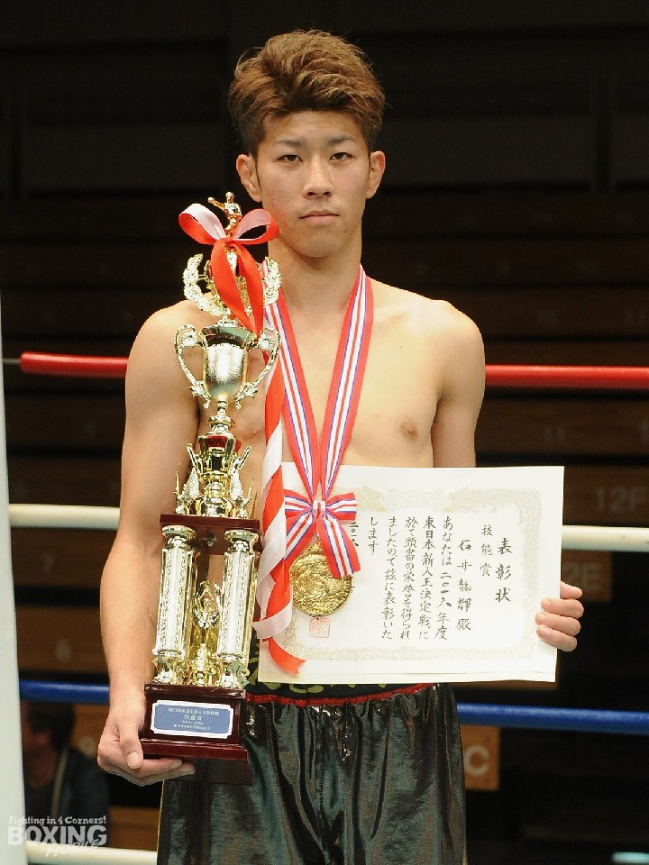 技能賞は石井龍輝(船橋ドラゴン)。衝撃の1R3分7秒KOで森田陽(M・T)から白星を挙げた。「特にKOは狙っていませんでしたが習志野高校でやってきたボクシングが身についての技能賞だと思います。西の代表は4戦全勝4KOの強敵ですが、課題の大振りとガードの甘さを修正し頑張ります」と全日本新人王決勝戦を意識した。