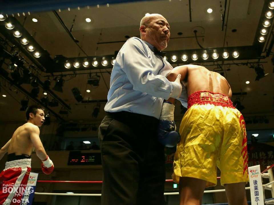 サウスポーの川浦はテーパヨーティン・シットダブニント(21=タイ)を相手に初回、サイドに動いてフェイントを入れながら左ストレートを好打して早くもペースを掌握。2ラウンド開始早々に左ストレートで先制のダウンを奪うと立ち上がってきたテーパヨーティンに右ボディでダウンを追加。さらにダウンを奪い防戦一方になったところでレフェリーが試合を止めた。
