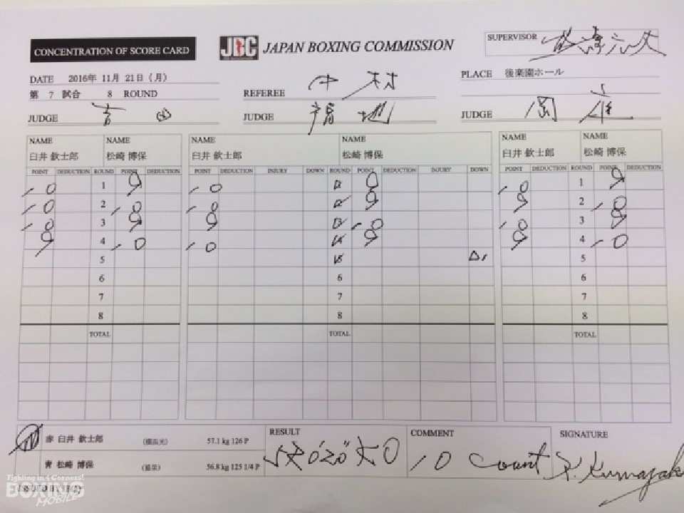 久しぶりのランキング復帰に闘志を燃やす松崎は左右フックを入れたが、臼井はガードで被弾を回避すると左フックを顔面、ボディに決めてダメージを与えた。4ラウンドは松崎がやりにくさを発揮してポイントを奪ったが、5ラウンド開始早々に臼井の右ストレートが直撃。キャンバスに転んだ松崎は立ち上がったが、レフェリーはカウントを数え上げた。