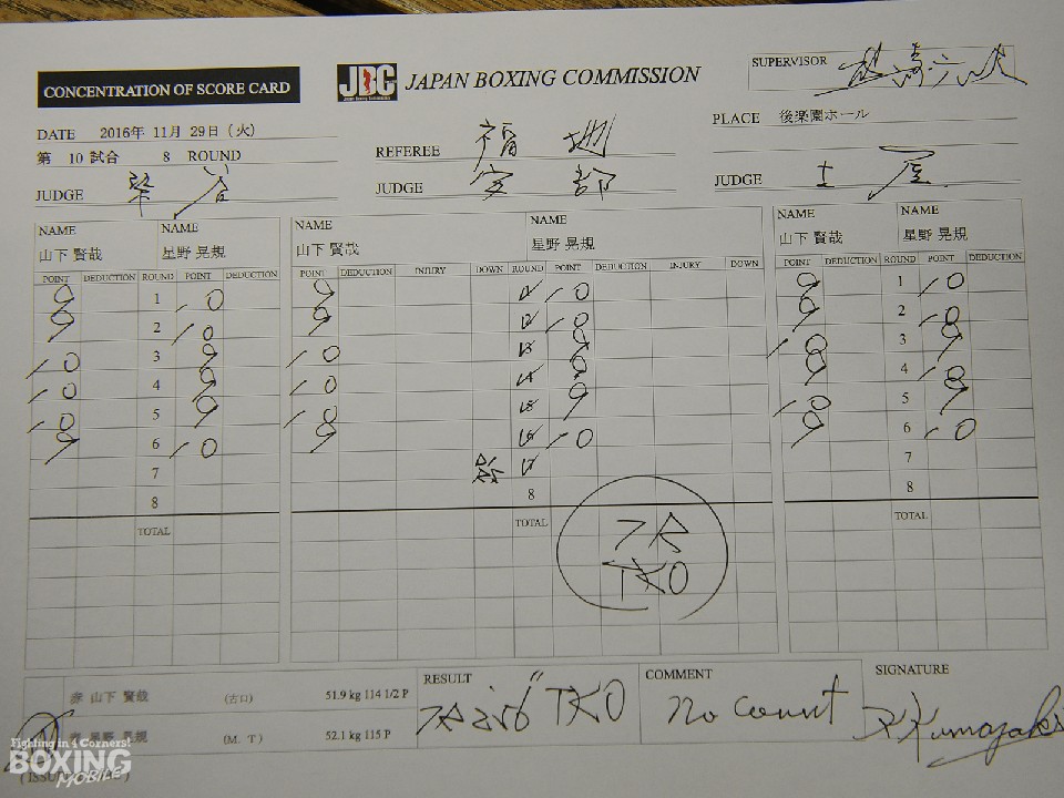 山下も右フックで飛び込むと連打で星野を追い込んだが、どうにもペースが掴めず。それでも7回にワンツーで攻勢をかけ一気に仕掛けた。左右をもらい膝を落とした星野だが、反撃に移ると渾身の右フックが直撃しダウンを奪った。立ち上がった山下だが足元がおぼつかず、フィニッシュに持ち込まれ最後はレフェリーに救出された。