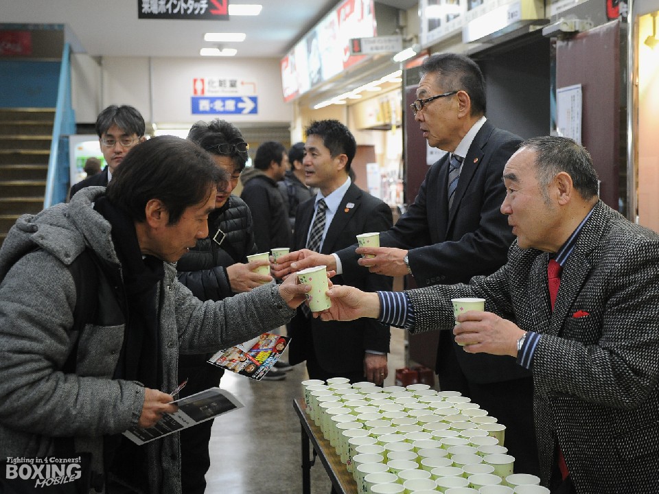 開場後には、渡辺協会長とファイティング原田名誉顧問が後楽園ホールのエントランスで来場者を迎え、恒例のお神酒を振舞った。今年もすべての選手たちの安全と活躍を願って止まない。