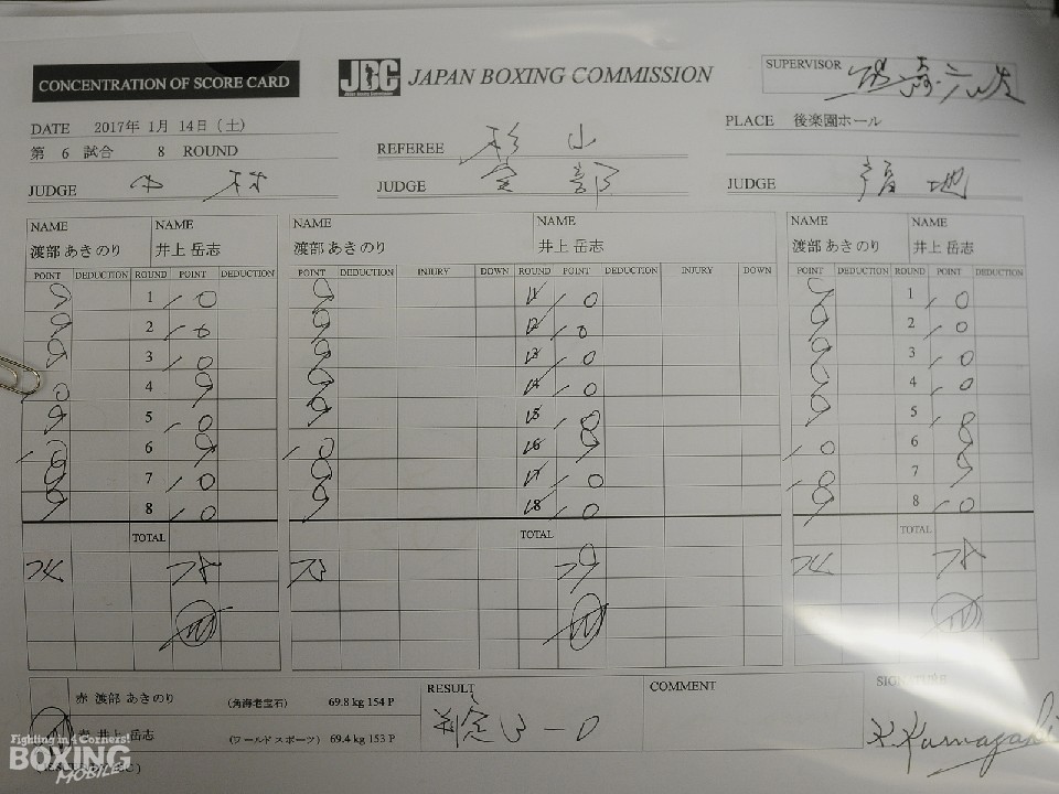 序盤は大振りの左フックを振るう井上の勢いに飲まれ、後手にまわる渡部だったが、中盤以降は井上の接近戦に苦しみながらも左をヒットさせ、相手のリズムを崩しにかかる。すると終盤は疲れを見せた井上と激しく打ち合いも、渡部のスタミナも残り少なく、決定的なチャンスを作れないまま試合終了のゴング。勝敗はジャッジに委ねられ、有効打で上回った井上の手が上がった。