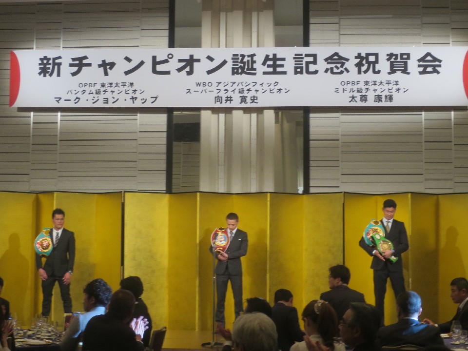 3名の新チャンピオンが誕生した六島ジムが30日、日航ホテル大阪でファンと後援会関係者総勢200人を集めて祝勝会を開催した。昨年11月11日にチャンピオン山本隆寛(井岡)を相手に5ラウンドKO勝利を収めて、東洋太平洋バンタム級チャンピオンを戴冠したフィリピン出身のマーク・ジョン・ヤップ(28)に続き、昨年11月23日に開催された5大タイトルマッチで、王者のドワイト・リッチーを判定で下し、東洋太平洋ミドル級チャンピオンに輝いた太尊康輝(24)とWBOアジアパシフィックスーパーフライ級王座決定戦で見事に2ラウンドKO勝利を収め、5度目のタイトル挑戦で夢を叶えた向井寛史(31)が揃って登壇し、今年の抱負を語った。