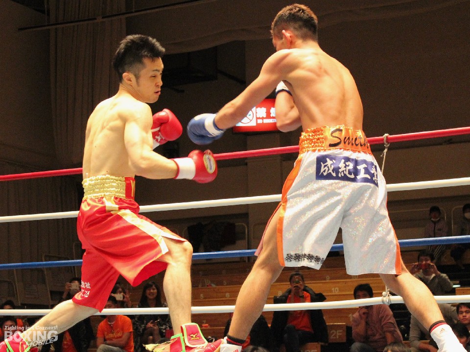 第7試合はデビュー同士による一戦。両者とも初回からスピード感溢れる攻防を見せるなか、サウスポー矢斬佑季(25=花形)が右フックでスミス健人(21=勝又)の左目上を切り裂きレフェリーストップ勝ちを収めた。