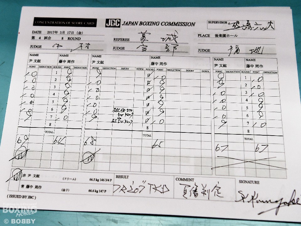 立ち上がりは藤中がプレスをかけて左フックを上下にヒット。後手に回った尹はガードを固めて左ボディを突き刺し反撃した。混戦を抜け出したい藤中は左右のフックで襲い掛かったが、尹は徹底して左ボディを打ち込むと連打でロープに詰めてポイントを稼いだ。7回、尹は偶然のバッティングで左目上カット。試合はこれでストップし尹が2-0の負傷判定勝ちを収めた。