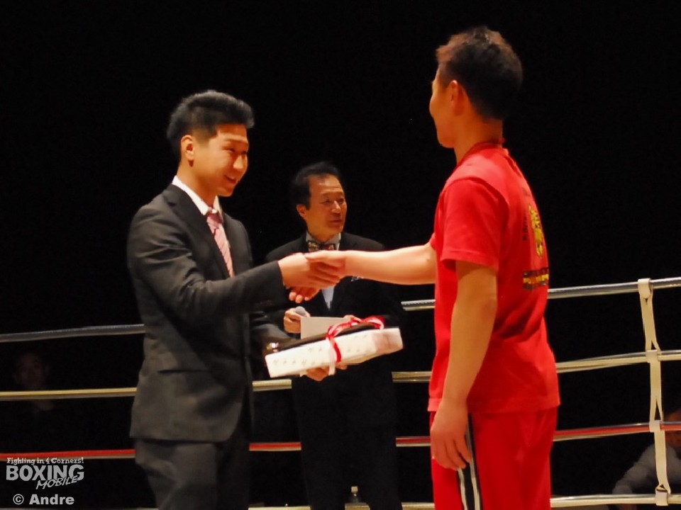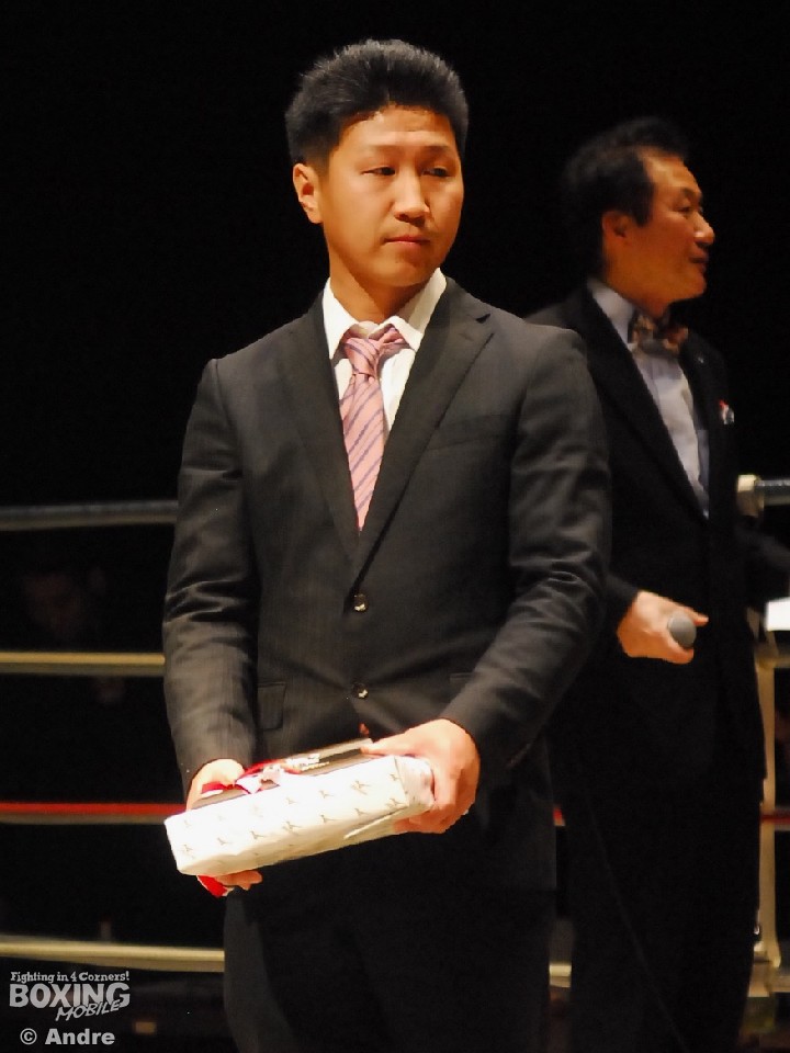 引退式の冒頭、姫路木下ジムの木下孝志会長から「大内は目の怪我で引退することになりました。15歳からうちに来て、途中は東京のジムに行きましたが、帰って来てタイトル戦までやることができました。皆様の応援のおかげです。大内、また第二の人生で生活が落ち着いたら後輩のためにジムにも顔を出してくれな、今までありがとう。これからも頑張って」と心のこもったエールを贈った。