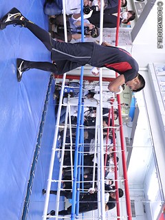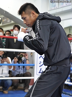 公開練習に移り、内山は軽めのシャドーながらもサウスポー対策からか、右ストレートから入る場面が目立った。スパーリングでは横浜光ジムの石井会長代行の視線の突き刺さる中、サウスポーのミドル級、齋藤志朗選手をパートナーに2ラウンドを行った。