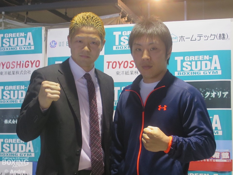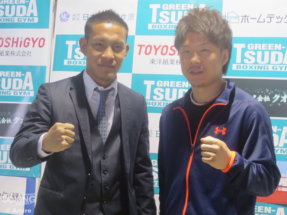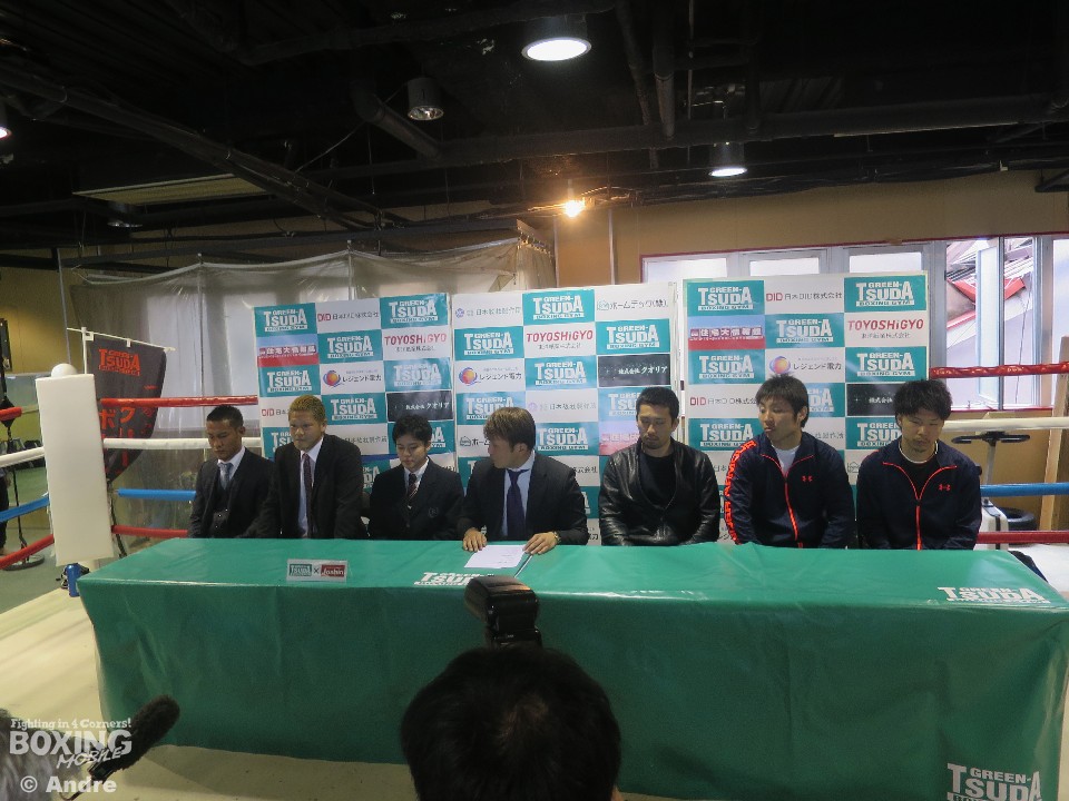 横浜光ジム陣営が記者会見に大阪入り。大阪にあるグリーンツダジムで19日、東洋太平洋ランカーの田中一樹(グリーンツダ)と昨年の敗戦から再起を目指す、日本スーパーウェルター級4位の矢田良太(グリーンツダ)、さらに女子高生ボクサーの小村楓香(グリーンツダ)が揃って次戦の発表会見を行った。この会見には、田中の対戦相手で14年度新人王の高橋竜平(横浜光)と、矢田の対戦相手でWBOアジアパシフィックスーパーウェルター級チャンピオンの松永宏信(横浜光)が同席し、それぞれの意気込みを語った。