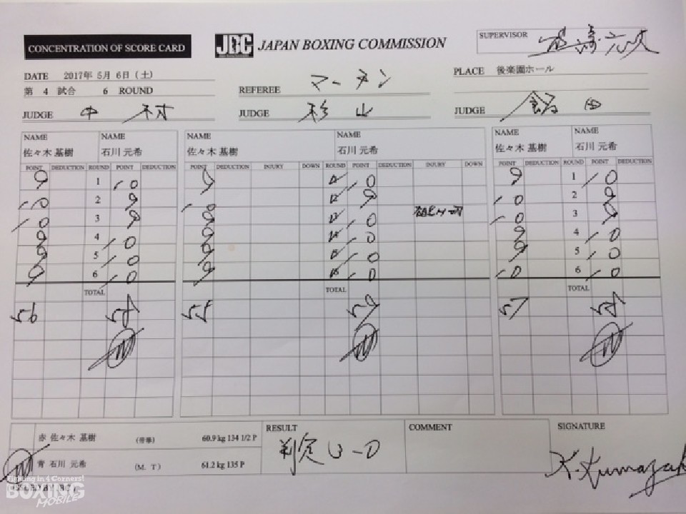 初回、長身サウスポーの石川が左アッパーで膝を揺らしてペースを握るが、佐々木も接近戦に持ち込んで右目上を切り裂いて反撃。しかし、4回以降は石川が丁寧にジャブを突きワンツーを再三ヒット。自分のボクシングに徹した石川が最大4ポイント差をつけて判定勝ち。ランキング入りを濃厚とした。