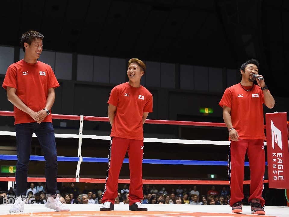 25日、日本スーパーライト級7位の井上浩樹(25=大橋)がメインを飾った「THE BOXING SHOW」では、メインイベント前に大橋ジム所属のWBO世界スーパーフライ級王者の井上尚弥(24)、前IBF世界ライトフライ級王者の八重樫東(34)、五輪銅メダリストで日本フェザー級10位の清水聡(31)が揃ってリングに上がり、ファンに挨拶した。