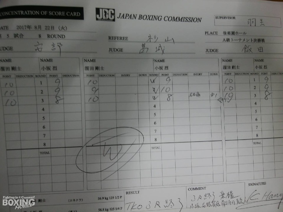 初回、小坂は中間距離から右ストレートを放つが、溜田はボディから右を好打。一進一退の攻防を繰り広げていたが、パワーで勝る溜田が徐々にペースを握ると3回に左フックで棒立ちに上下への連打で膝まづかせた。このラウンドを凌いだ小坂だったが、眼窩底骨折の疑いがあり棄権を申し出た。連敗を止めた溜田が見事なKO劇でベルトを獲得した。