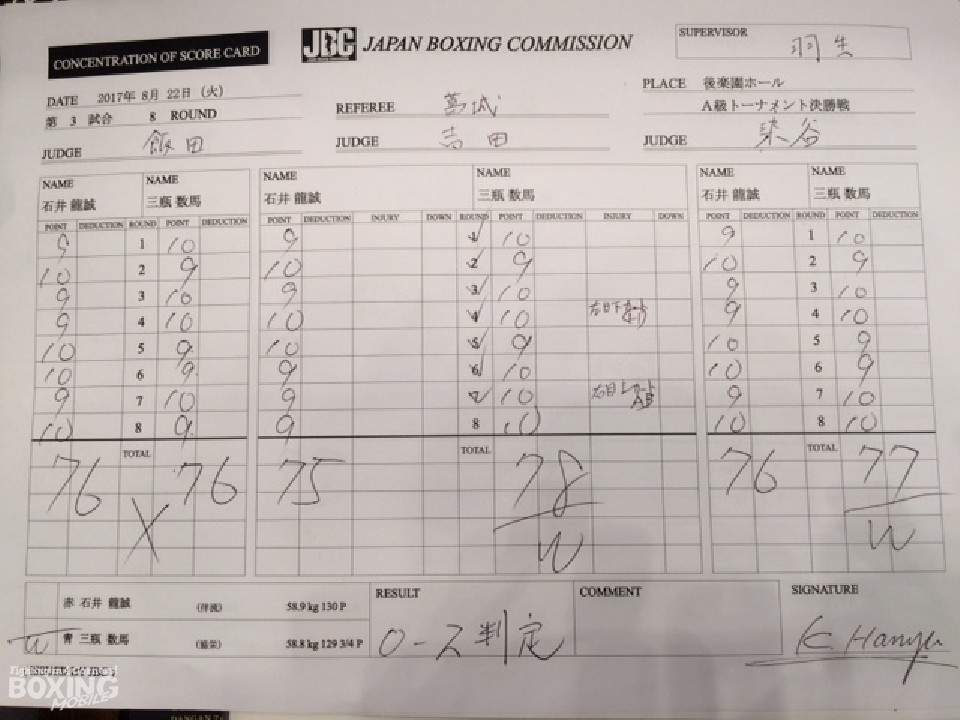 初回、石井が一瞬の飛び込みから左を突き出すが、三瓶は強いプレスから右ボディを叩くと左ストレートを振り抜いた。その後も三瓶はボディにパンチを集め着実にポイントを加点。後手に回った石井は左フックを返すが空を切ると連打を浴びて後退した。しかし、5回になると石井はワンツーで腰を沈め反撃の糸口を作った。後半は両者とも一歩も引かない打撃戦となったが、三瓶が手数で上回った。ジャッジ2者の支持を得た三瓶が接戦を制した。