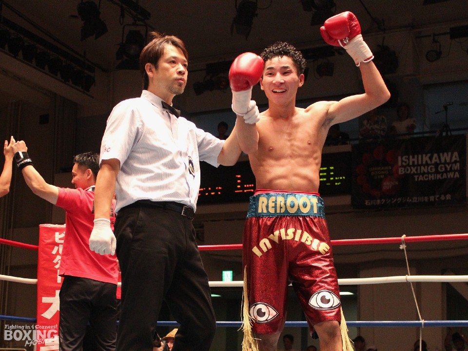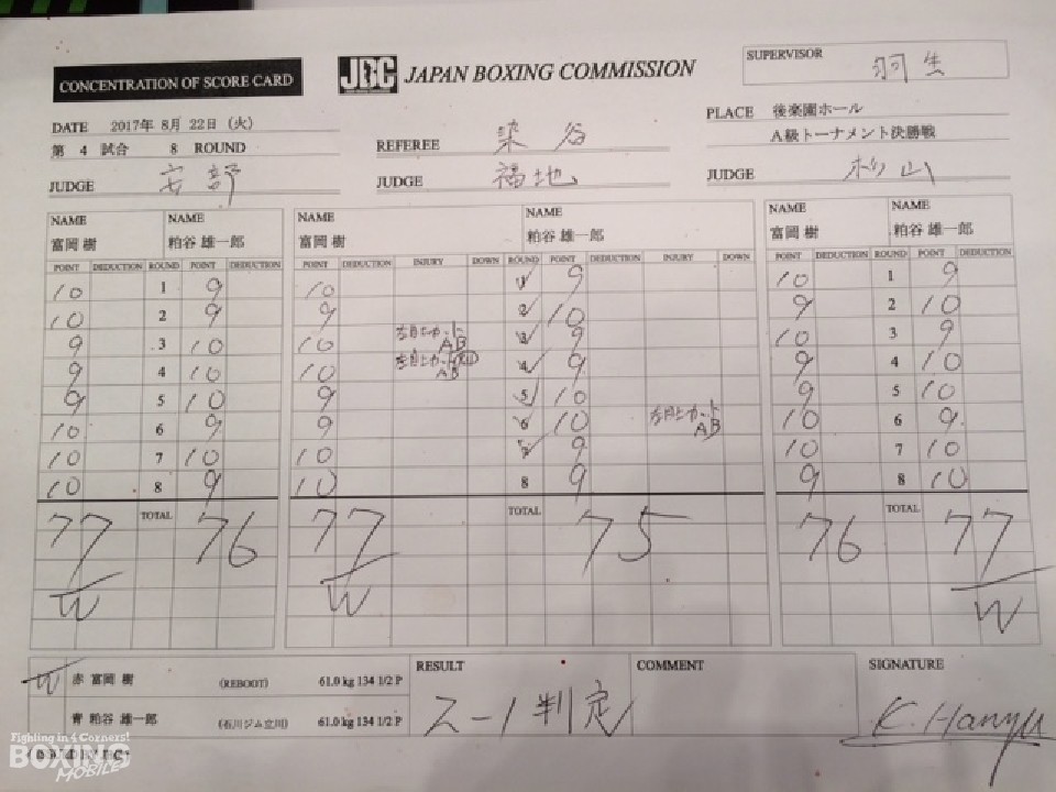 富岡が長いリーチを生かし、ジャブと右ストレートでポイントをピックアップ。粕谷は被弾しながらもかまわずグイグイ前に出るとワンツーで反撃した。中盤、富岡はスイッチを繰り返し軽打を決めれば、粕谷も距離を詰めてボディを叩いて対抗した。激しいペース争いは最後まで繰り広げられ勝負は判定へ。採点は割れたが富岡に軍配が上がり接戦を勝ち抜いた。