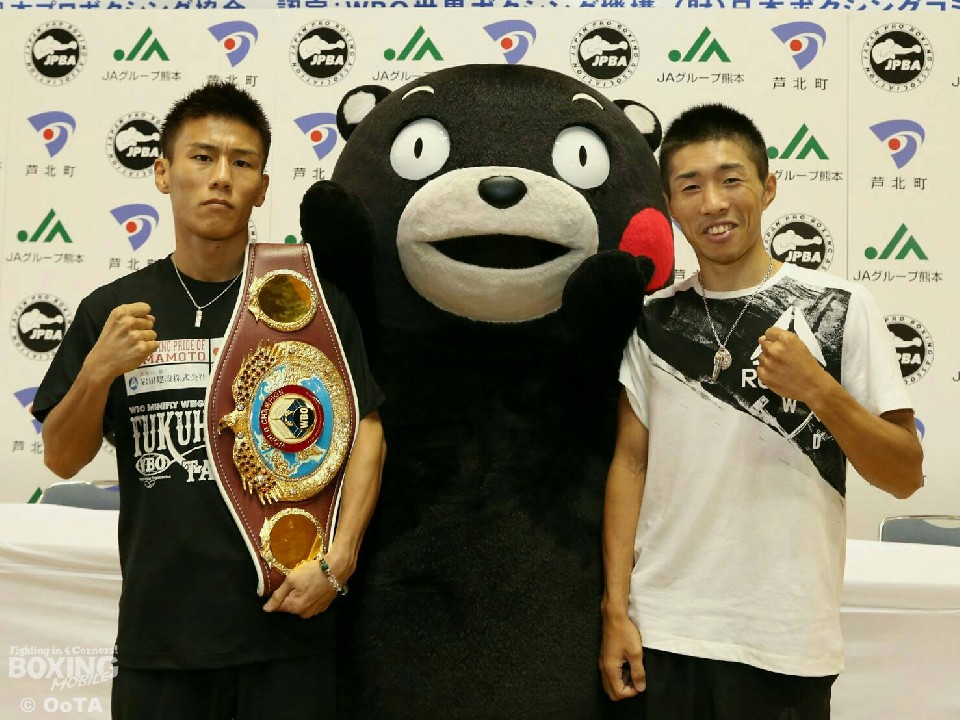 WBO世界ミニマム級タイトルマッチで拳を交えるチャンピオンの福原辰弥(本田F)と挑戦者の山中竜也(真正)が25日、決戦の地、芦北町民総合センターに場所を移して調印式を行なった。また、会場には人気アイドルグループの少女隊と熊本を代表するゆるキャラ「くまモン」も応援に駆けつけ会場を盛り上げた。