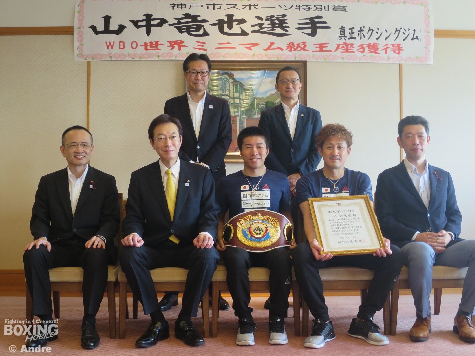 久元喜造神戸市長は「山中選手、チャンピオンおめでとうございます。ジムの先輩の長谷川穂積選手のように、もっともっと強いチャンピオンを目指して神戸市民に勇気と希望を与えてください」と、労いの言葉をかけた。